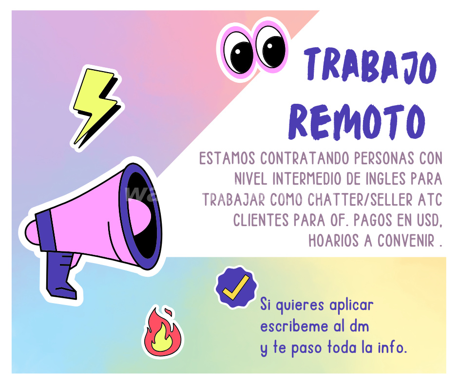 Busamos personas que sepan ingles y quieran un trabajo remoto, responsable para Chatter/Atc al cliente bilingue. Enviando y respondiendo mensajes y promocionando suscripciones. Se ofrece sueldo fijo en dolares mas comisiones por ventas.